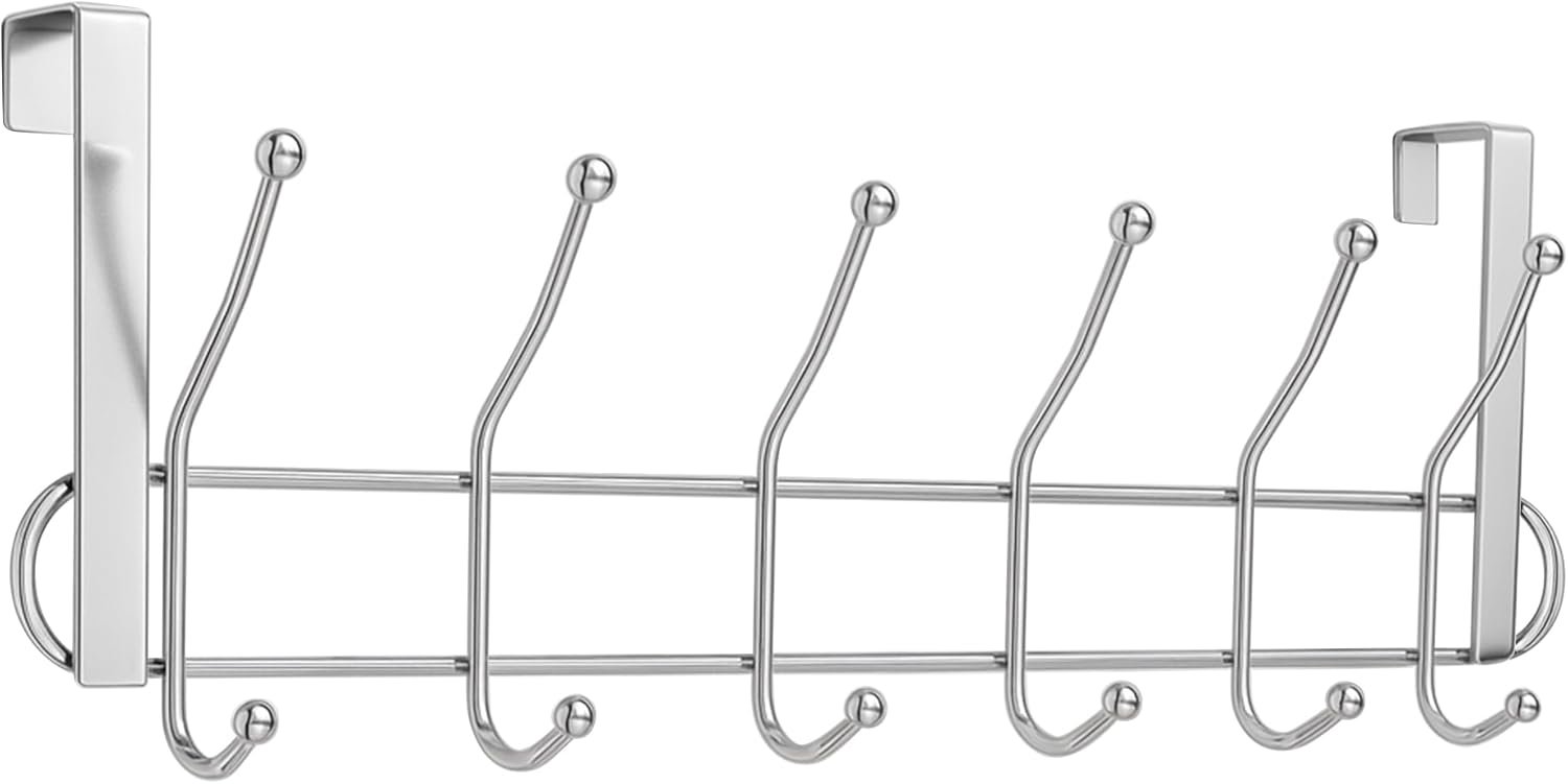 - Functional & Effective Clutter Organizer – The over door hooks with double hook design has 12 large hooks to hold more and heavier items, making full use of the unused space behind the door to easily organize messy coats, hats, towels, bags umbrellas and etc. The door hanger can create great storage space for your laundry room, bathroom, bedroom, living room and more.