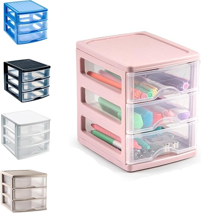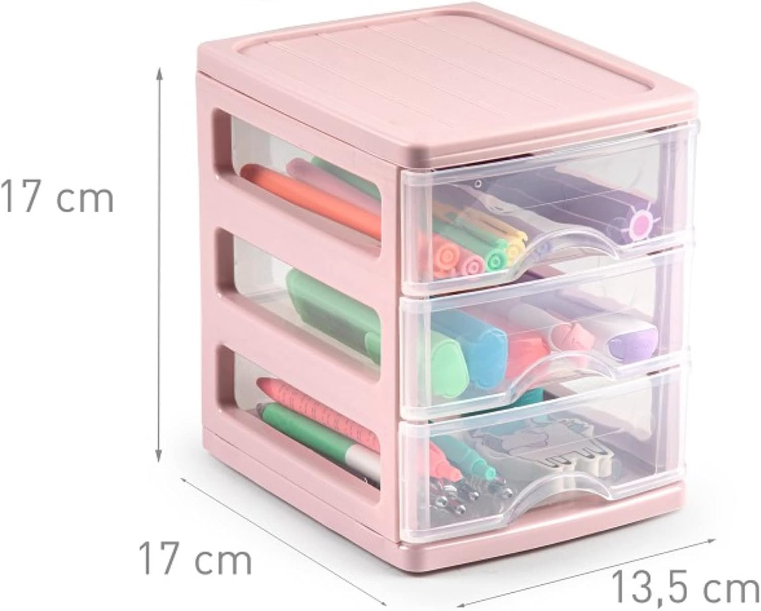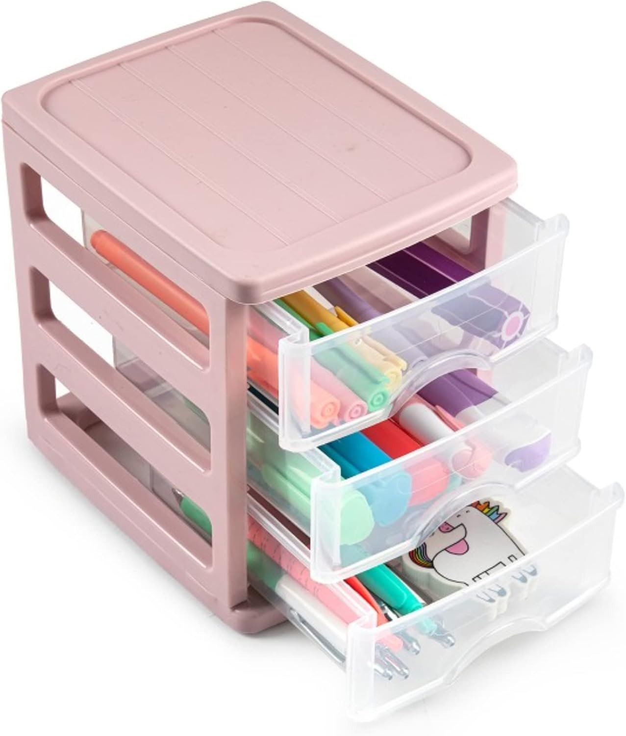 Plastic Desktop Storage Unit with Drawers, Stationary Arts Drawer Desktop Tabletop Organiser Storage Tower Unit for Office Bedroom Garage ((17 x 13.5 x 17cm, Pink with 3 Clear Drawers))