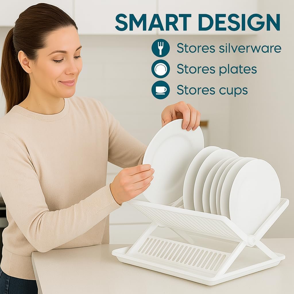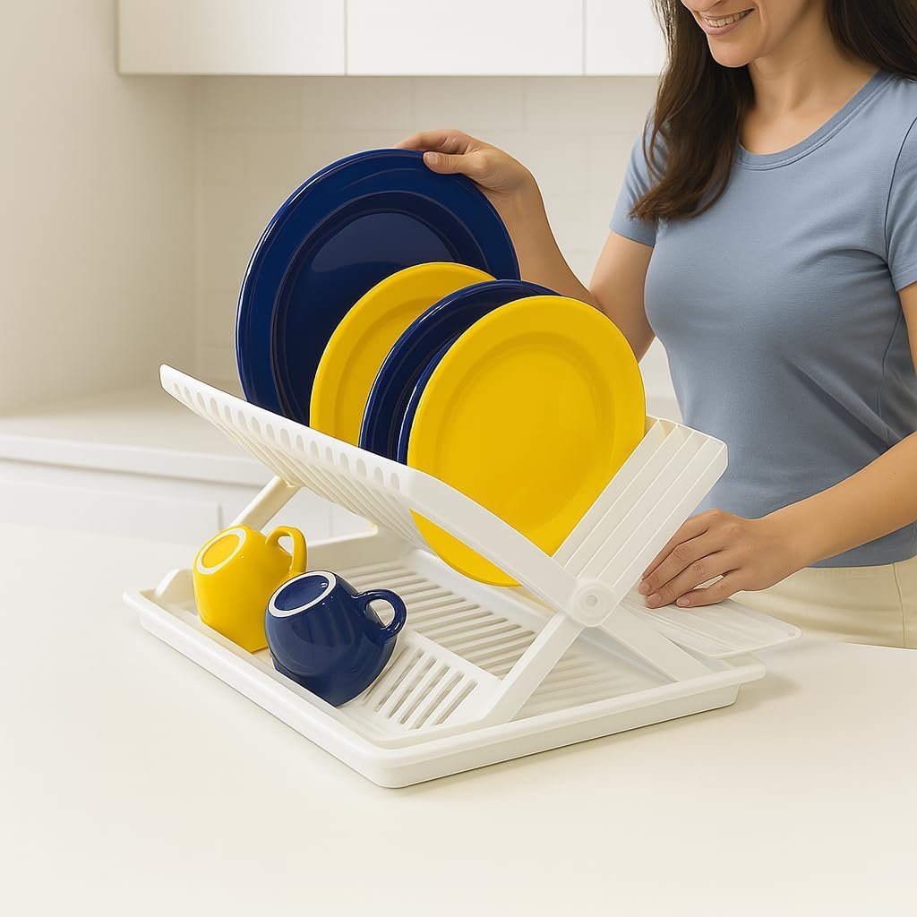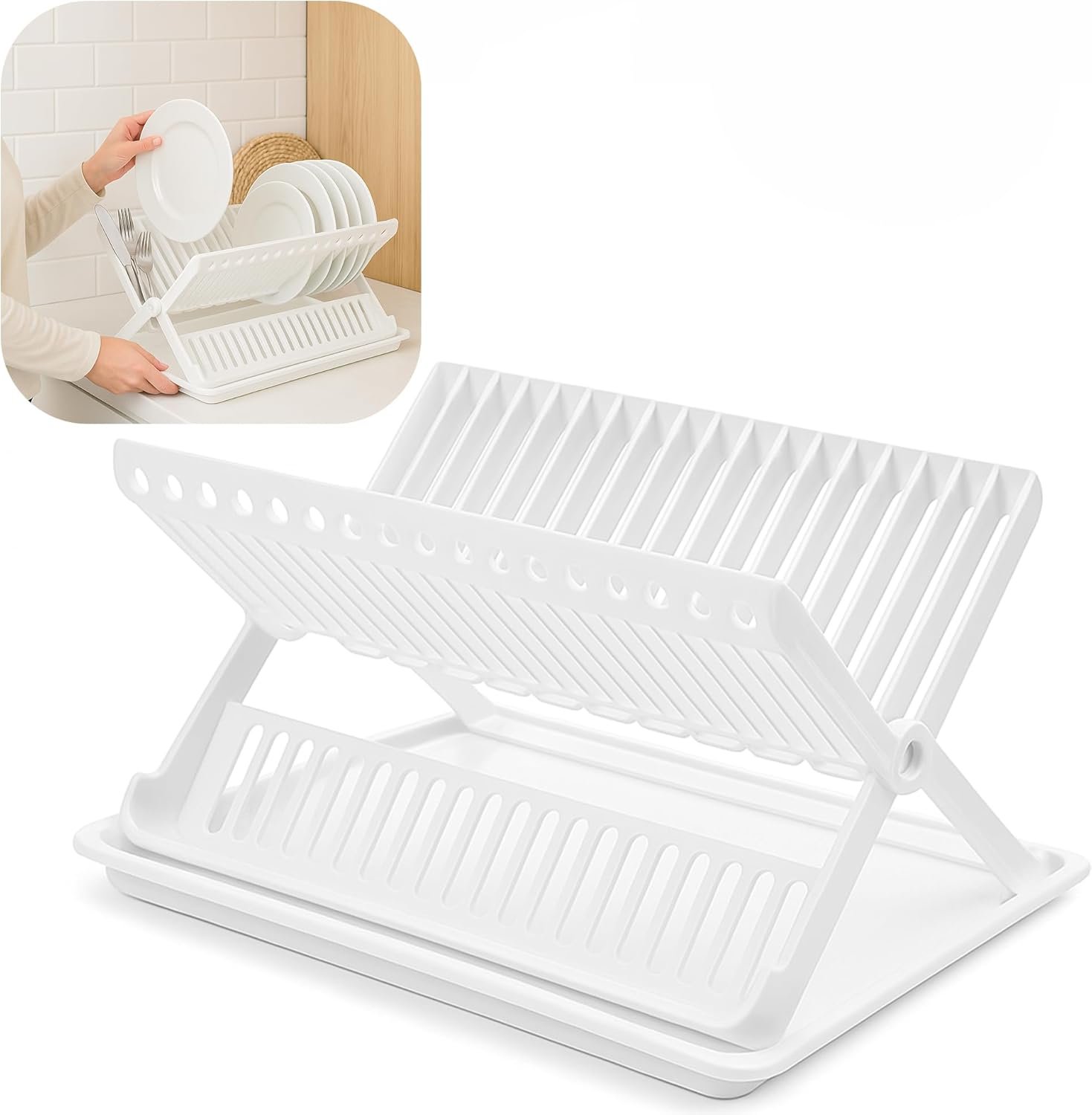 - DISH DRAINER WITH TRAY – This small dish drainer can hold a surprising amount of items, such as plates, cups, bowls, and more! The plastic tray of this folding dish drying rack absorbs any surplus moisture, allowing you to use this drying rack on any kitchen surface.