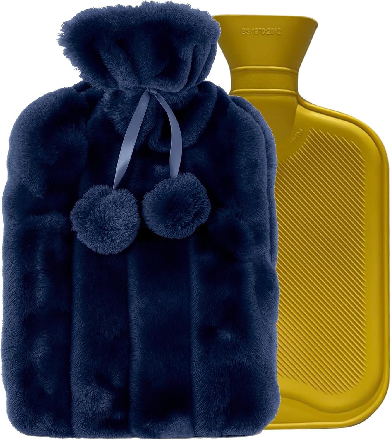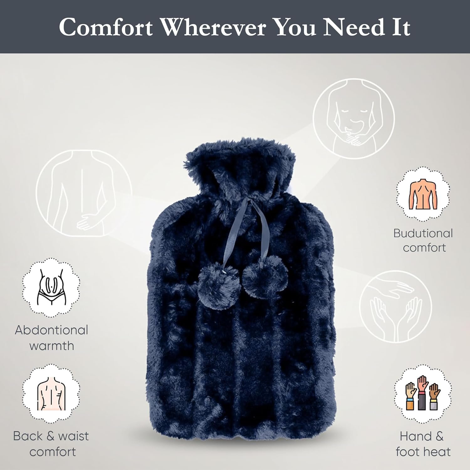 Stylish 2 Litre Hot Water Bottle with Dark Blue Faux Fur Cover – Luxury Plush Heat Bottle for Cold Nights & Body Pain Relief